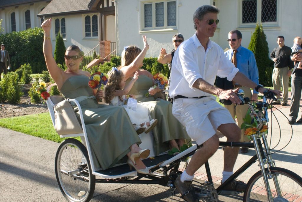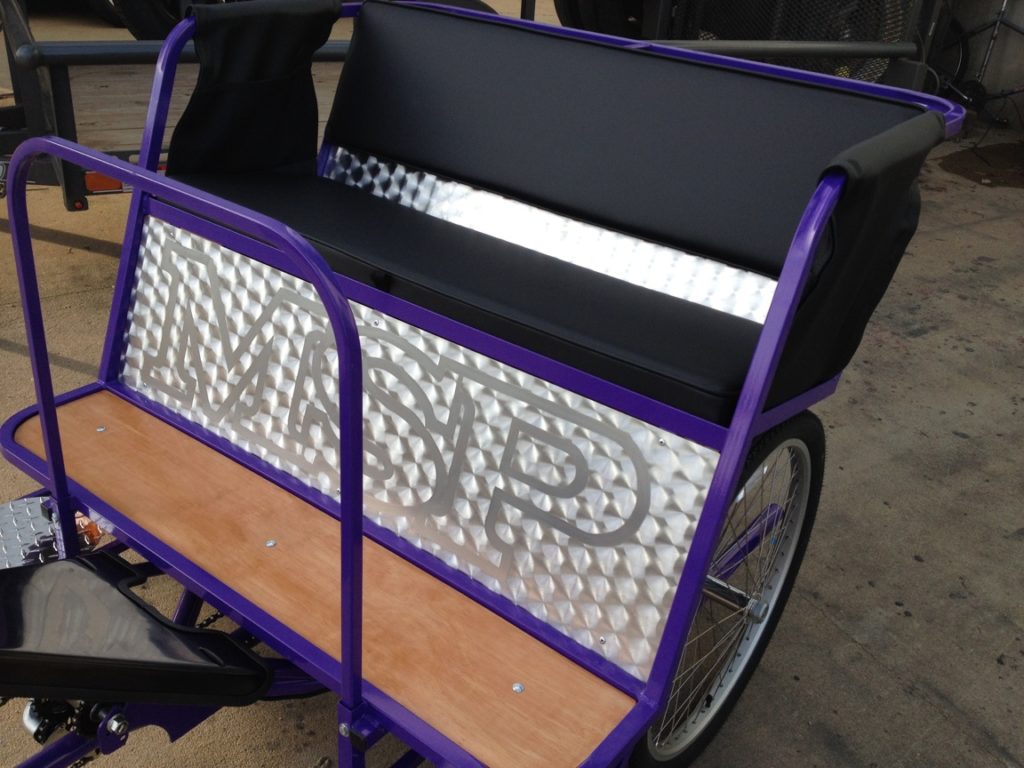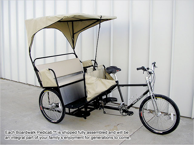 Each Boardwalk Pedicab™ has a strong, round, tubular steel alloy chassis with powdercoat finish & heavy duty steel axles. Features include 11″ side steps for easy entry, heavy duty triple-clamp fork and a 48″ seat for comfort with an optional storage area underneath. The passenger cab is steel sub-frame with comfortable vinyl upholstery in a variety of color choices. Padded seats, armrests with storage pockets, handrail and step is standard. Braking is provided by a revolutionary hydraulic 8-3/4″ rear disk brake and supported by a front V-brake. The Boardwalk will be an integral part of your family’s enjoyment for years to come.