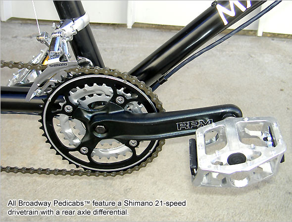All Main Street Pedicabs™ use a Shimano 21-speed drivetrain with a rear axle differential and indexed, grip-shifting. View all our official Main Street Pedicab parts & tools.