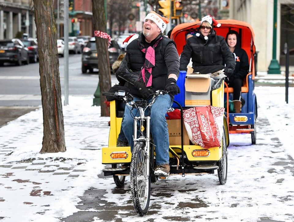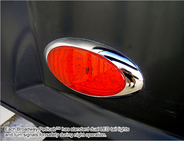 We took our proven pedicab chassis and put a larger passenger compartment to provide spacious 41″ three person seating that your passengers will love. Features 11″ side steps and handrail for easy entry, heavy duty triple-clamp fork, seat belts, integrated fenders and underseat storage. The Broadway pedicab has a strong, rectangular and round tubular steel allow frame with powder coat finish & heavy duty steel axles. Braking is provided by a revolutionary hydraulic 8-3/4″ rear disk brake and supported by a front V-brake. Comes with a complete 12 volt lighting system (turn signals, running & braking).