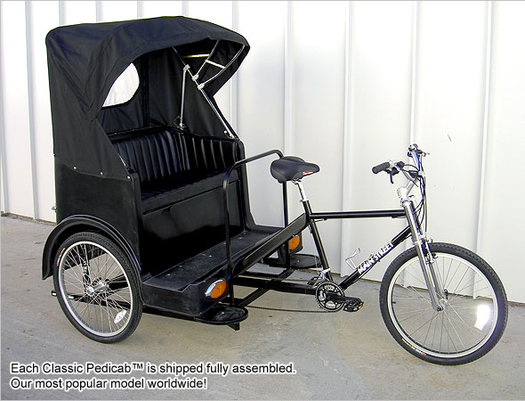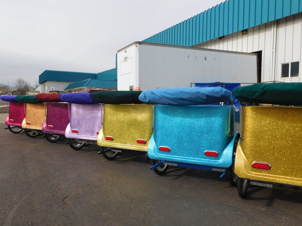 *Photo shows Classic frame. Also available with Broadway frame (includes front hand rail and side steps). We offer many models and options to meet your needs. To order your new pedicab, we ask for half of the total as a deposit to begin assembly. Balance is due prior to shipping. All prices are in USD and are for the base model. We accept Bank Checks, Money Orders, Visa and Mastercard. All Main Street Pedicabs™ are made in our Colorado, USA factory at 11811 Upham St. #9 Broomfield, CO 80020. Contact us to purchase your new pedicab.