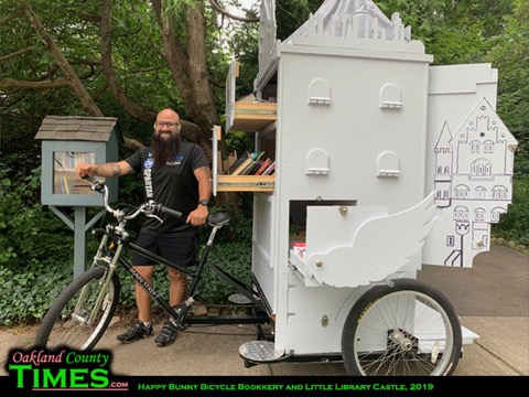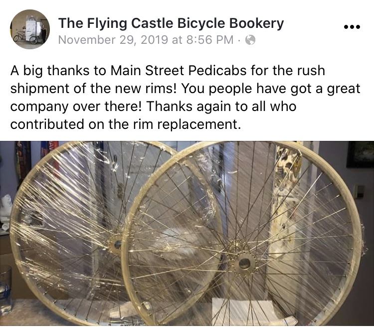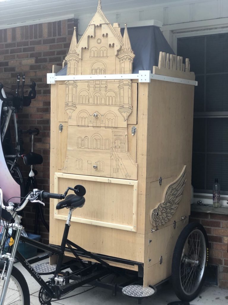 Summer of 2019, Rodriguez recycled a used Main Street Pedicab, making the magical Flying Castle Bicycle Bookery (a registered Little Free Library, on wheels)!
